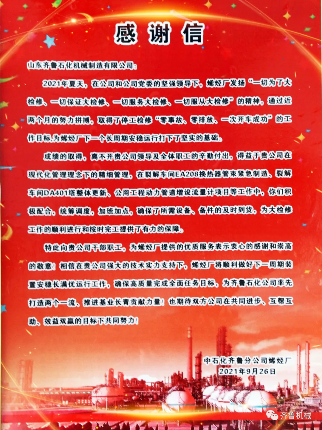 2021年9月30日中國石化齊魯分公司烯烴廠設(shè)備科副科長(zhǎng)丁文岳、設(shè)備科許潔為公司送來感謝信,感謝機(jī)械公司全體員工在檢修期間響應(yīng)號(hào)召,積極配合,加班加點(diǎn),攻堅(jiān)克難,全力保障檢修,確保維修設(shè)備及更新設(shè)備及時(shí)準(zhǔn)確的供應(yīng)。